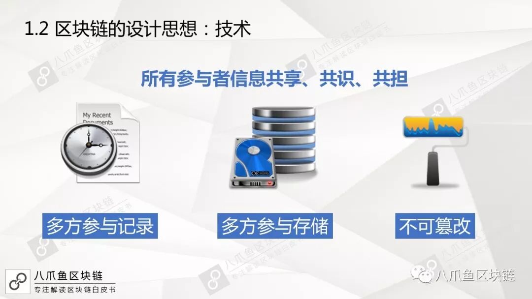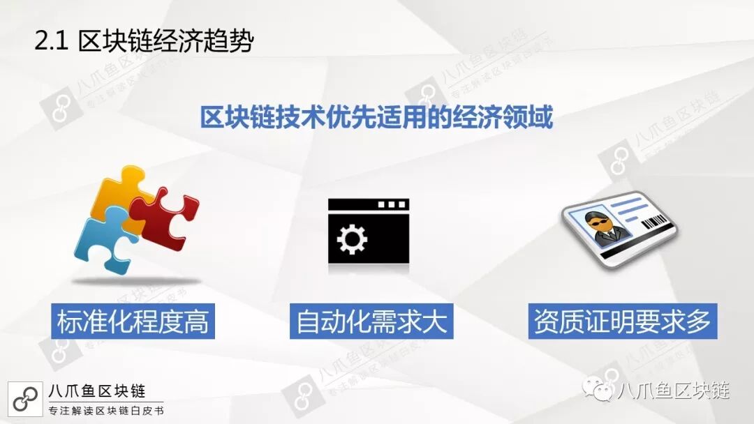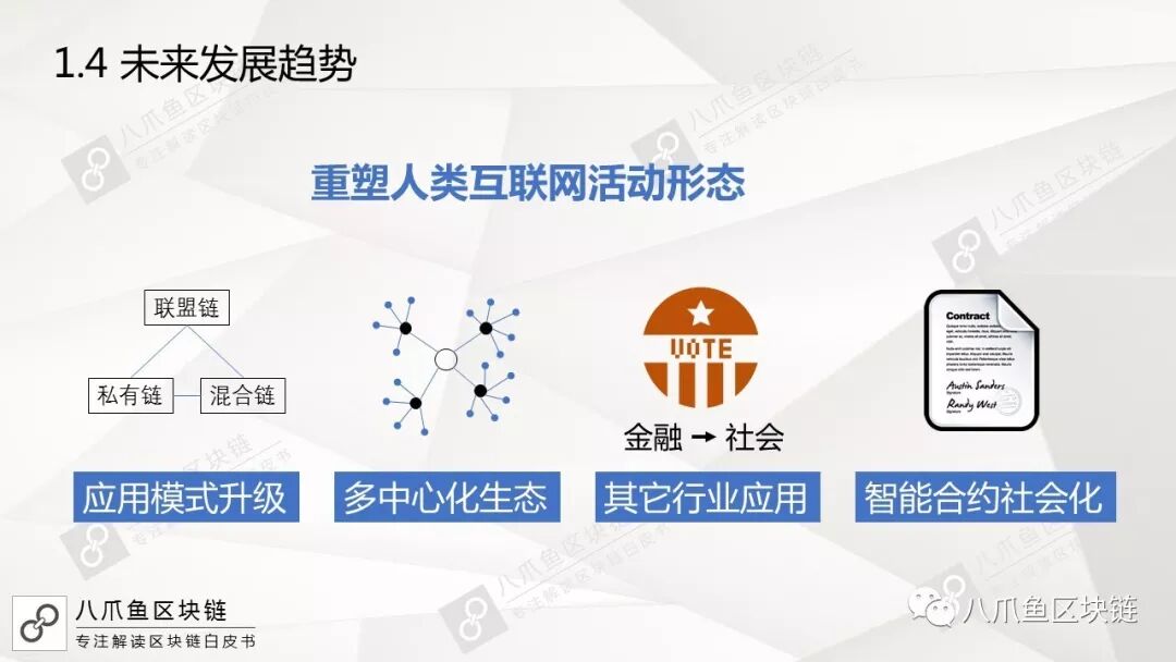 * 多中心化:未来区块链系统架构将是构建可信任的多中心体系,将分散独立的各自单中心,提升为多方参与的统一多中心,从而提高信任传递效率,降低交易成本。