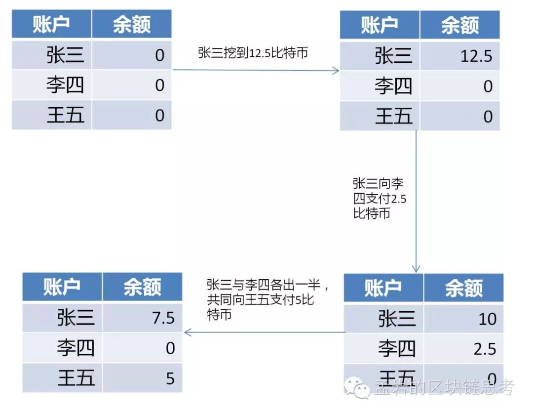 我们假设一个这样的场景:张三挖到12.5 枚比特币。过了几天,他把其中 2.5 枚支付给李四。又过了几天,他和李四各出资 2.5 比特币凑成 5 比特币付给王五。